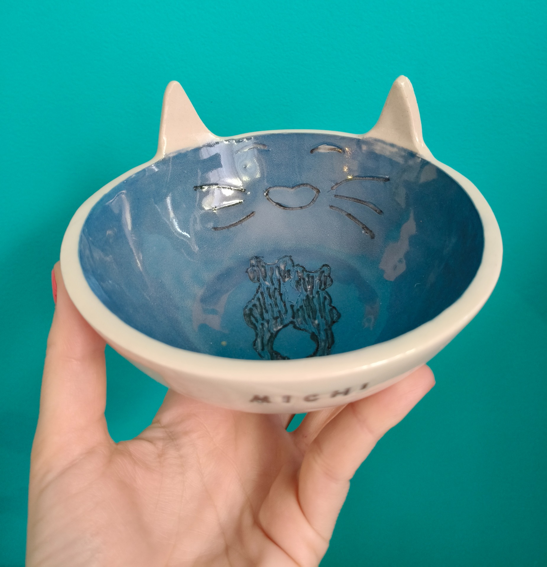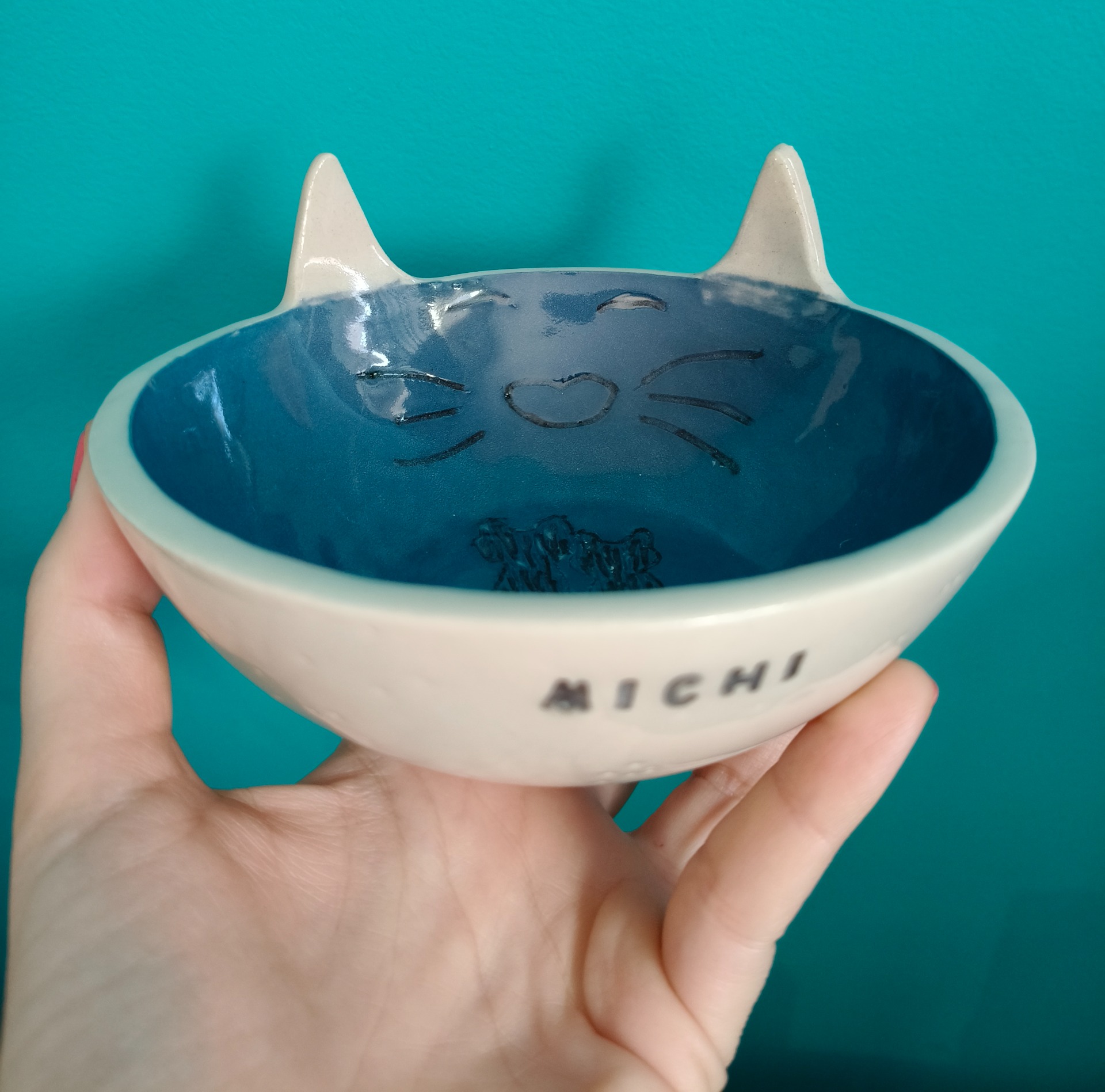 Comedero para gatete, decorado a mano con interior en azul oscuro y la silueta de dos gatos, orejitas de ato en su borde y la palabra ''Michi'' en su exterior. ¡Justo el comedero que se merece tu bonita mascota! Hecho con gres blanco de alta calidad y durabilidad.