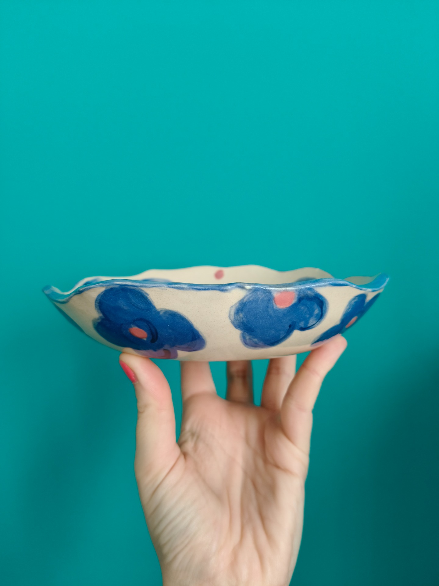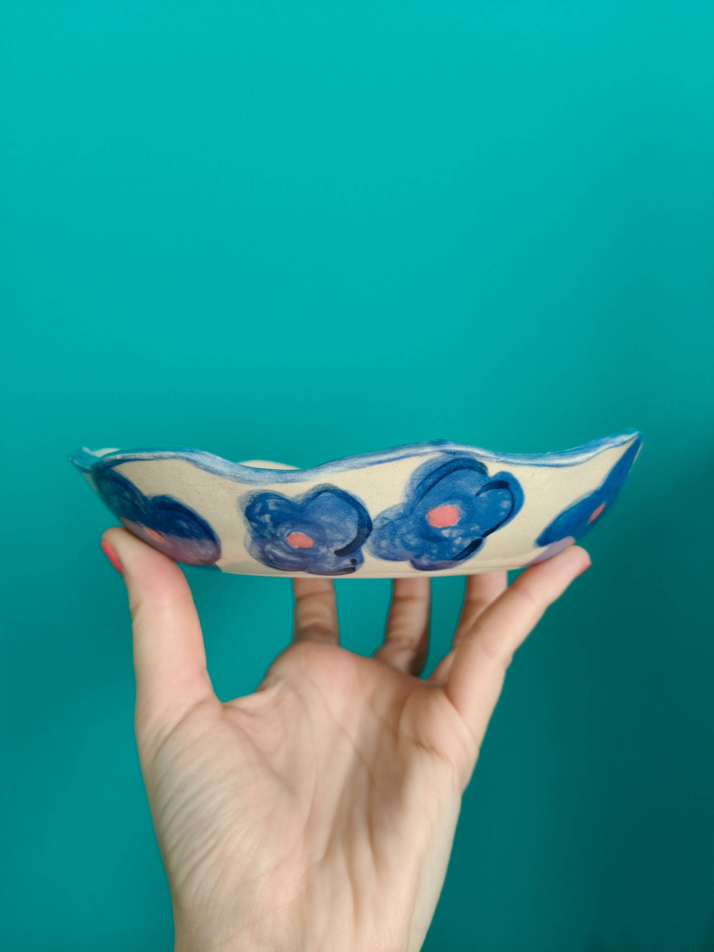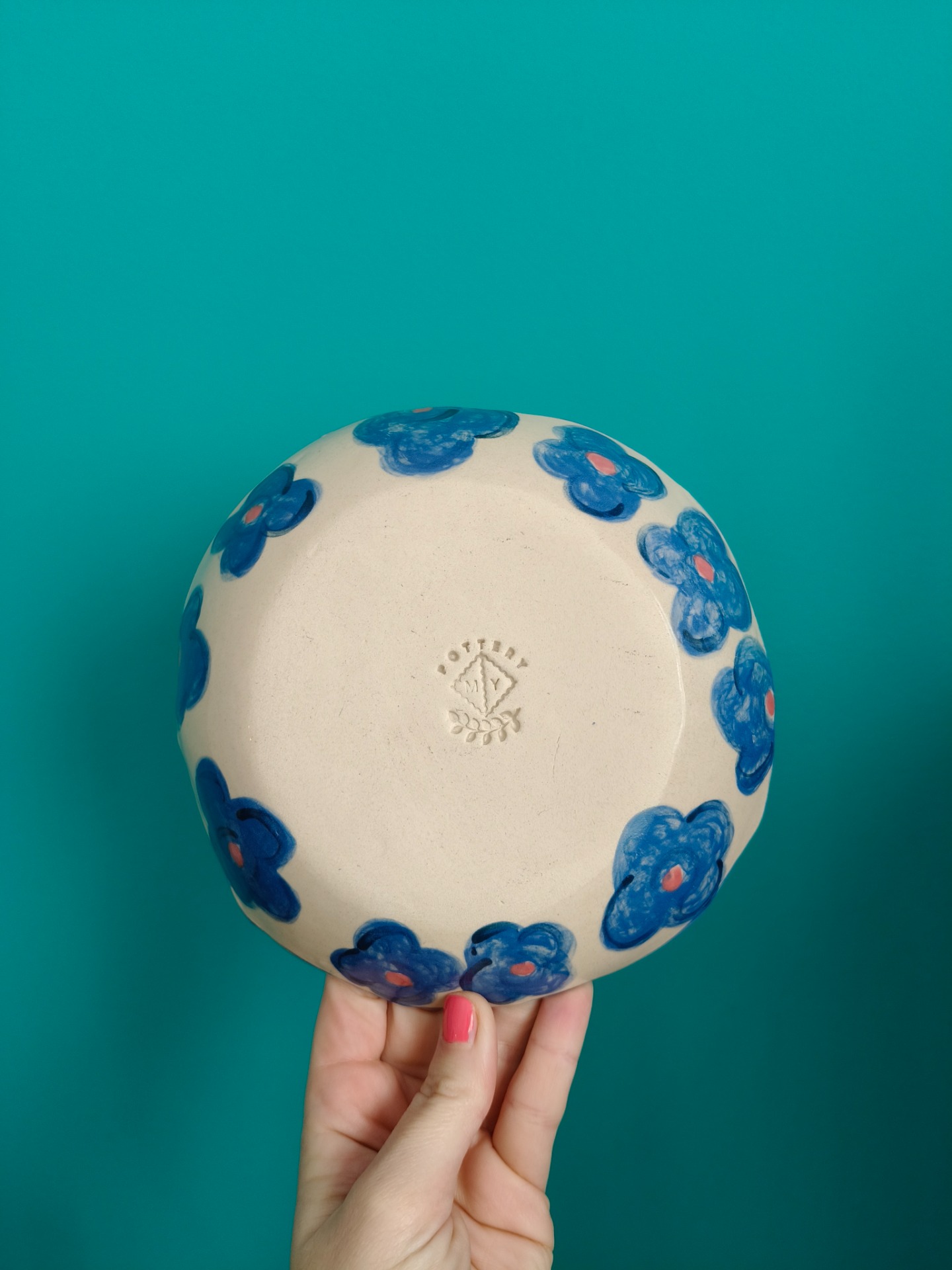 Cuenco pequeño, decorado a mano con flores azules en su interior y exterior. Gres blanco de alta calidad y resistencia. Apto para microondas, horno y lavavajillas.